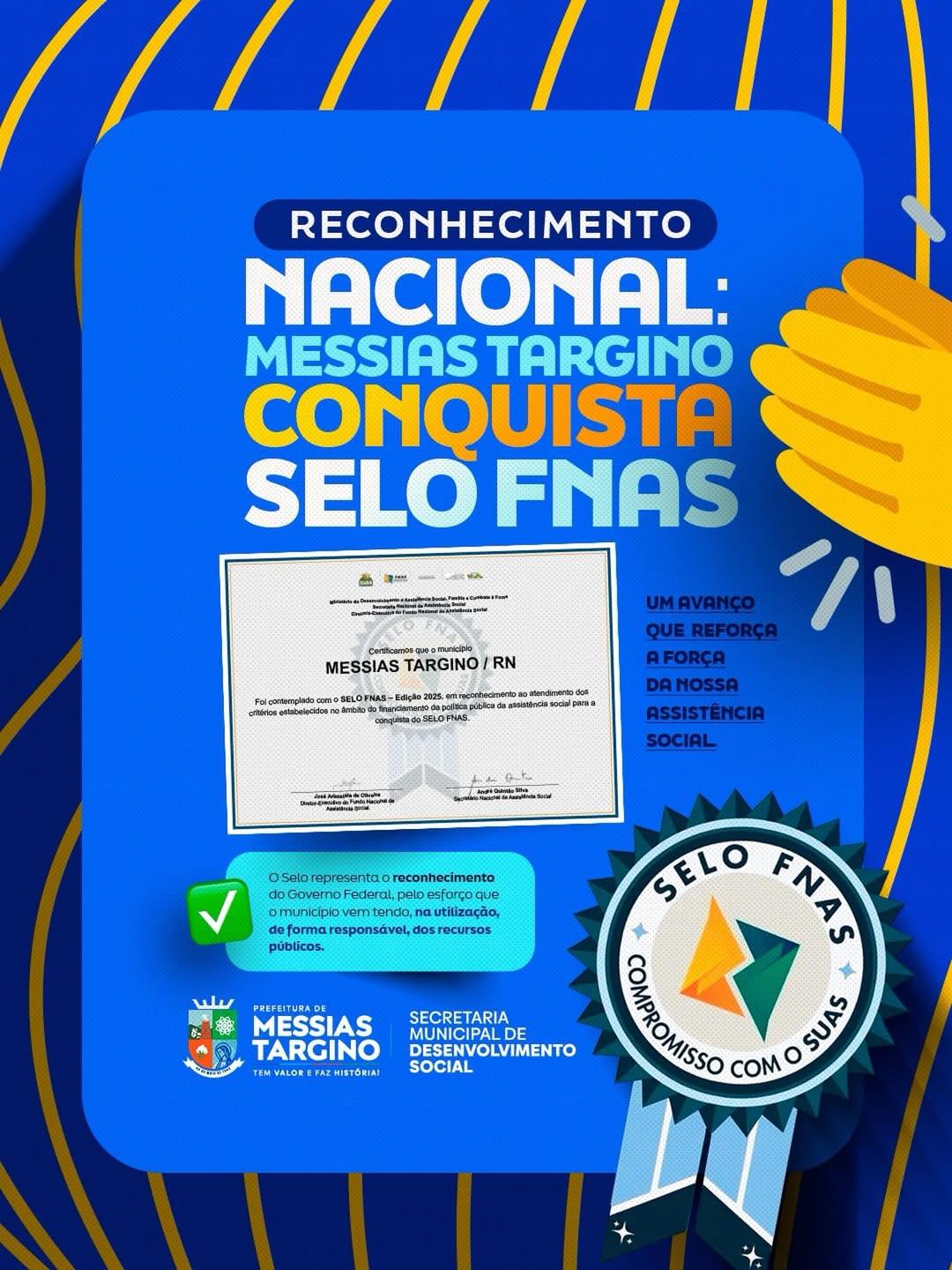 Messias Targino conquista o Selo FNAS 2025, um importante reconhecimento nacional pelo compromisso, responsabilidade e transparência na gestão dos recursos da assistência social.