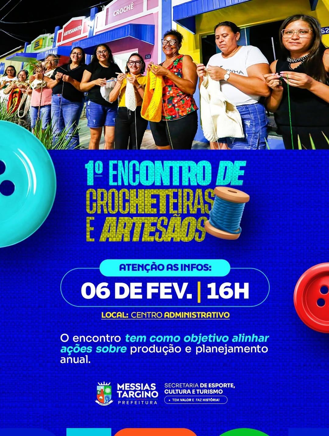 A Prefeitura de Messias Targino convida todas as crocheteiras e artesãos para o 1º Encontro de Crocheteiras e Artesãos, um momento especial de diálogo, troca de experiências e alinhamento de ações voltadas à produção e ao planejamento anual.