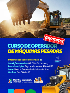 A Prefeitura de Messias Targino está oferecendo Curso de Operador de Máquinas Pesadas com aulas teóricas e práticas. Não precisa...